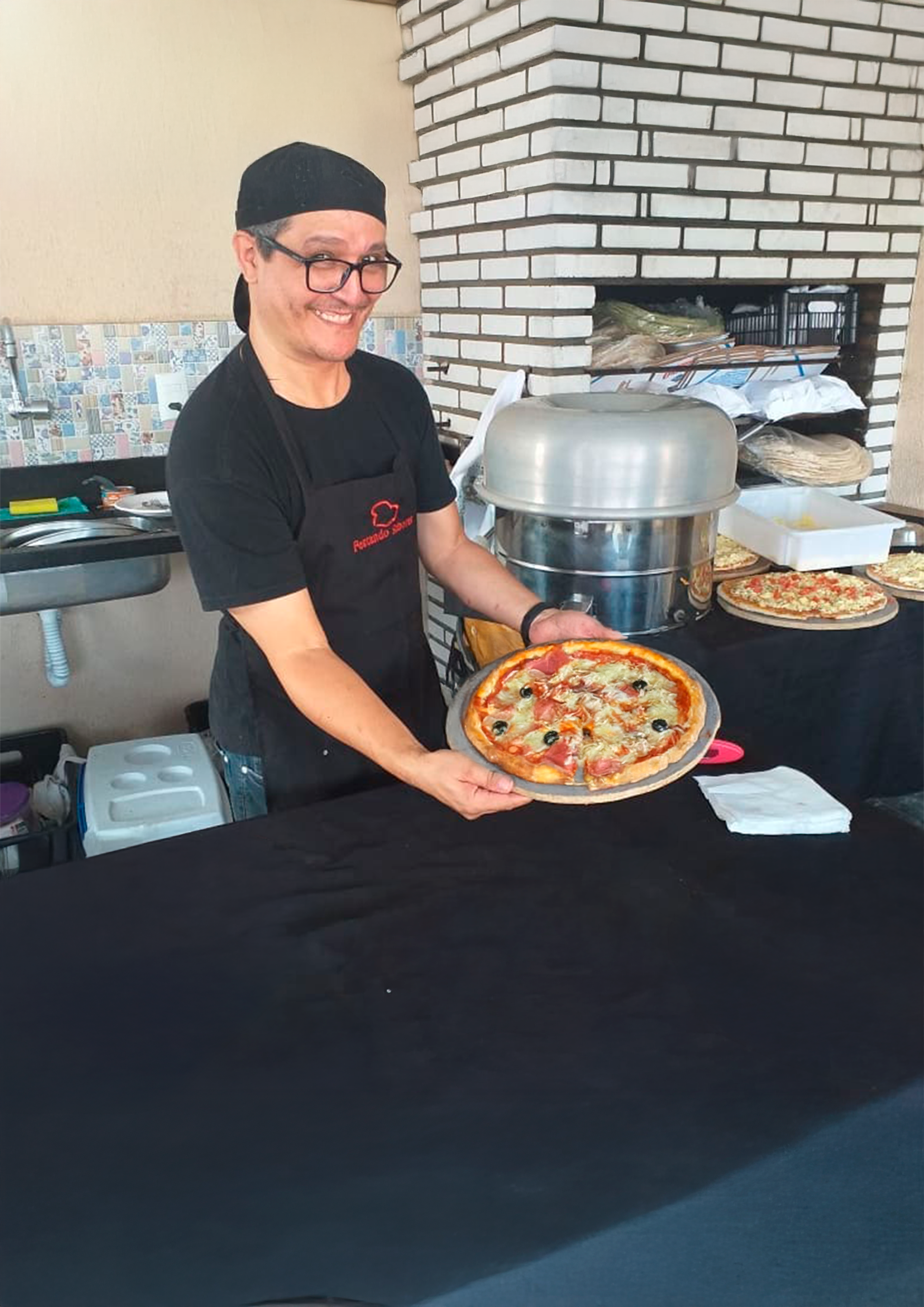 Nossa festa de pizza conta com uma estrutura de rodízio de sabores, onde as pessoas vão se servindo e conversando.